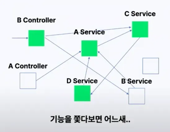 아래 이미지는 서비스 간 의존성이 꼬이면서 스파게티 코드가 형성되는 문제를 보여줍니다.