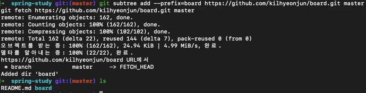git subtree add --prefix=<기존레포지토리명> <기존레포지토리주소> <기존메인브랜치명>