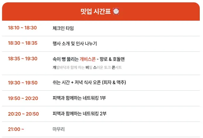 개비스콘 시간이 끝난 후 본격적인 저녁식사와 네트워킹 시간이 있었다. 저녁은 피자와 맥주(논알콜도 있어요)가 준비되었고 네트워킹 시간에는 포지션별로(BE, FE 등) 사전에 조가 편성되어 있었다. 그리고 각 조 별로 향로님 또는 호돌맨님과 이야기할 수 있는 시간도 있었다. 나는 BE포지션으로 다양한 연차 및 회사의 분들과 이야기를 나눌 수 있어서 좋았다. 각자의 고민들도 들어보고 각자의 생각을 나눌 수 있었다. 그리고 가장 신기했던 건 내가 지금 항해 플러스 백엔드 6기과정을 진행하고 있는데 5기 수료생 분이 같은 네트워킹 조에 있어서 신기했다.