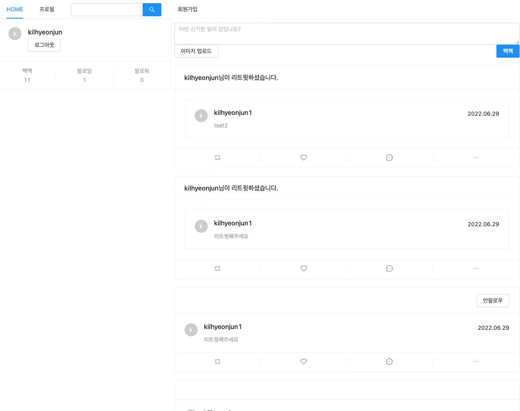 - 게시글·댓글 CRUD — 게시글 작성·수정·삭제, 댓글 작성, 좋아요·리트윗 기능 구현